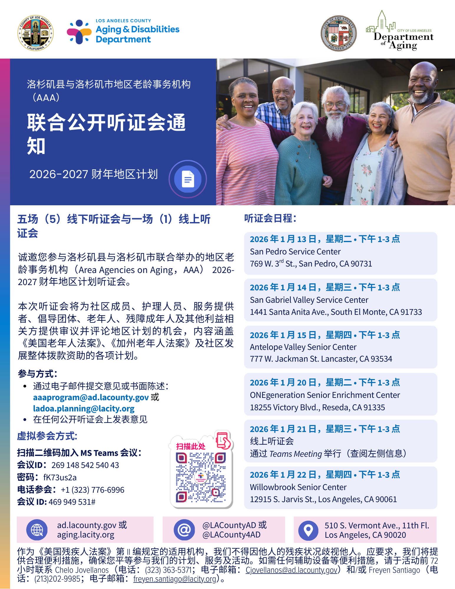 You are invited to participate in the joint County and City of Los Angeles public hearings on the Area Agencies on Aging FY 2026-2027 Area Plan. The public hearings will provide an opportunity for community members, caregivers, service providers,